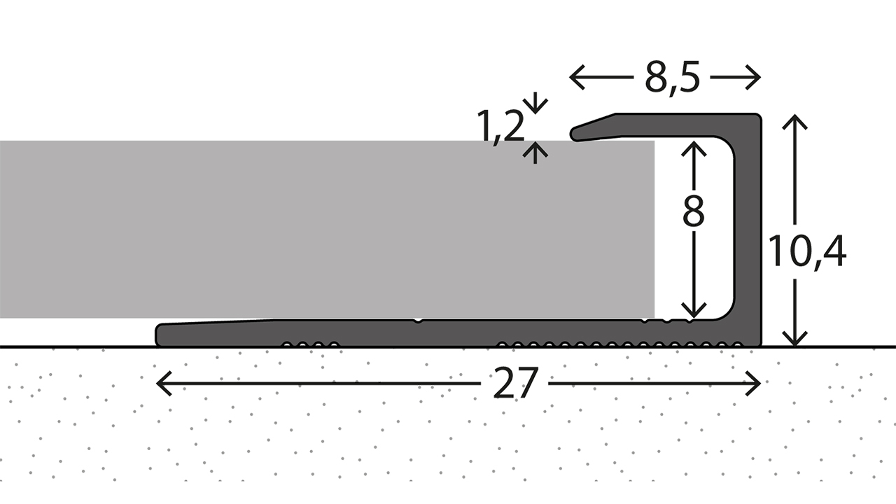 Das Abschlussprofil 941 ist ein universell einsetzbares Aluminium-Abschlussprofil. Es ist für Belagstärken von 7,5-8 mm ausgelegt und eignet sich als Abschlussprofil sowie als Türanschlagprofil - ideal für einen sauberen Kantenabschluss mit dauerhaftem Schutz der Belagskante.