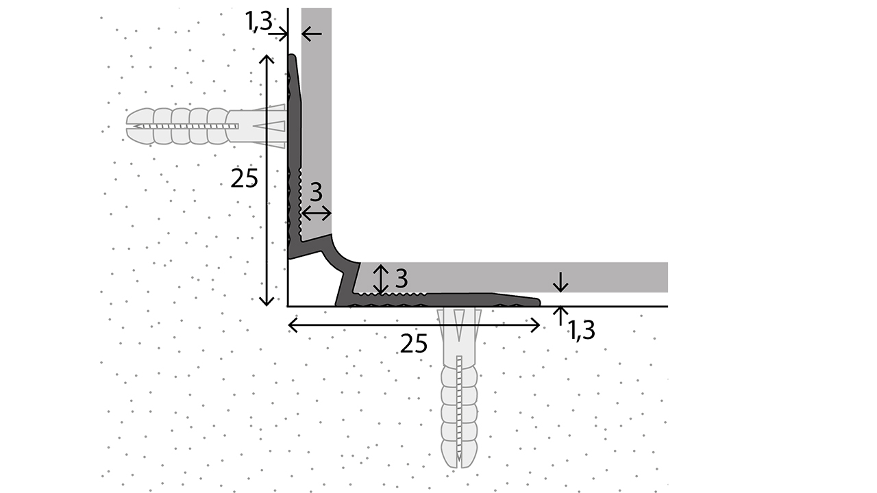 Mit dem Treppenkanten-Innenwinkel setzt du bei der Treppenrenovierung auf einen professionellen Eckabschluss: Der Innenwinkel schützt die empfindlichen Belagskanten in der Innenecke zwischen Tritt- und Setzstufe und unterstützt so eine dauerhaft saubere Optik - gerade bei Klebevinyl sowie textilen und elastischen Belägen in 2-3 mm Stärke. Dank versenkter Schraublöcher wird der Innenwinkel stabil befestigt und bleibt optisch dezent - für ein hochwertiges Ergebnis bei der Treppensanierung.